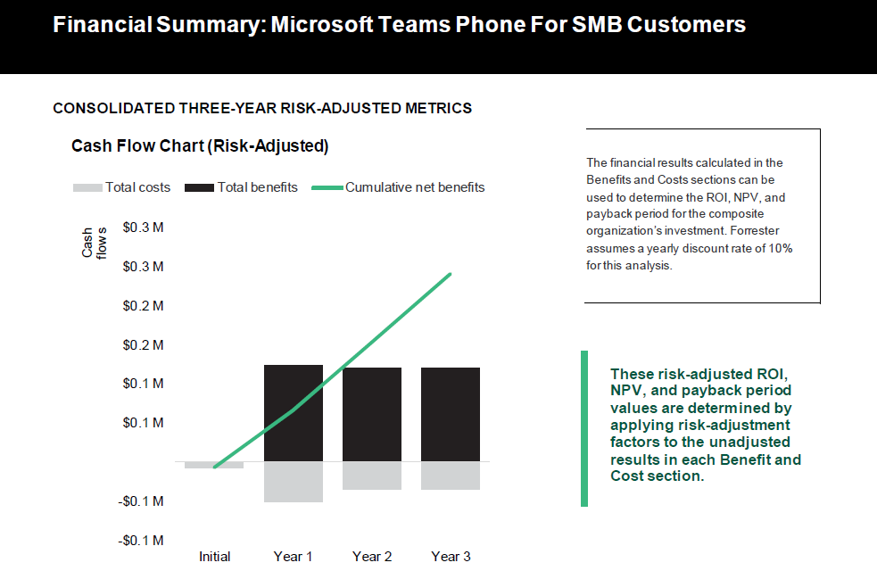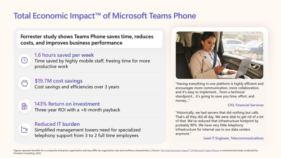 Microsoft Teams Phone is een moderne telefonieoplossing die spraak- en videocommunicatie integreert in Microsoft Teams. Het is een kans voor bedrijven om hun communicatie- en telefoonsystemen moderner te maken. Forrester interviewde 8 bedrijven die Teams Phone hebben geïmplementeerd. Grote bedrijven en mkb-bedrijven. Om zo inzicht te krijgen in de voordelen, kosten en risico’s van deze oplossing. Hiervoor is gebruik gemaakt van de Total Economic Impact™ methodologie van Forrester.