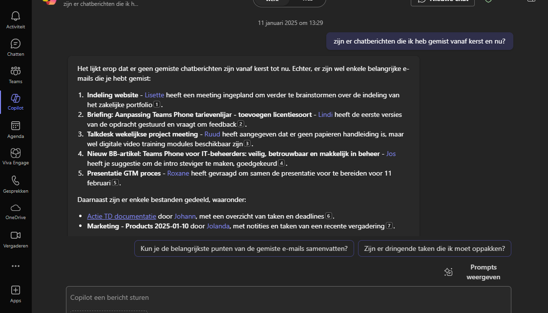 Als je terugkomt na een vakantie of een paar dagen vrij, heb je meestal veel chatberichten in Teams. Vooral in groepsgesprekken kan het hard gaan. Al die berichten doorlezen kost veel tijd. Hoeft niet meer met hulp van Copilot in Teams. Open Copilot in een groepschat, kies de optie Meer prompts en daarna highlights van de laatste 7 dagen. Copilot neemt het gesprek door en geeft je een samenvatting en een lijst van actiepunten van de afgelopen dagen. Als je wil, kan je de lijst om laten zetten in een tabel. Zo heb je nog meer overzicht.