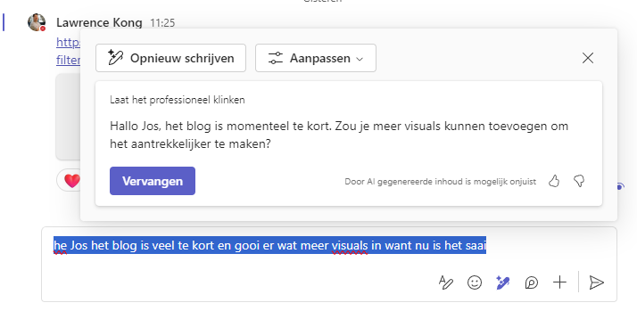 Met je directe collega praat je vaak anders dan met je leidinggevende. Betekent dat je een e-mail of Teamsbericht aan je directe collega in een andere toon schrijft. Copilot kan je daarbij helpen. Schrijf je bericht in Teams en vraag de slimme AI-assistent om het in een professionele, of juist meer informele toon te zetten. Kan gewoon als 1 lange zin of in bulletpoints. Copilot maakt er zelf een kloppend bericht van. Ook handig: de AI-assistent doet gelijk een spellingscheck voor je. Zo weet je zeker dat er geen taalfouten in je bericht zitten. Vragen om een lang bericht voor je in te korten, kan ook.